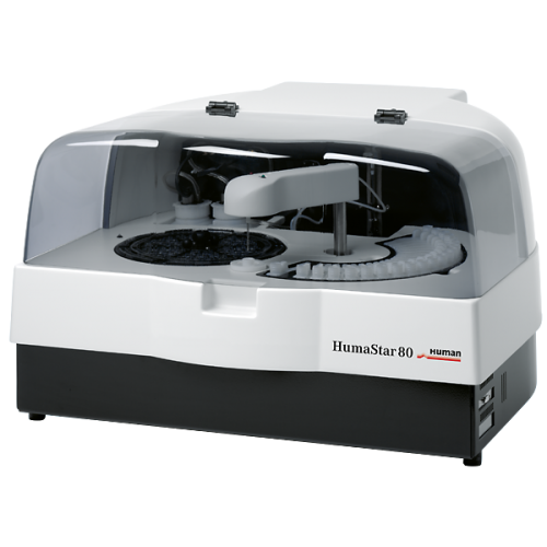 HUMAN HumaStar 80 is an open system which has a 20-position reagent tray to maximize the number of tests/samples at one time. It has a throughput of up to 80 tests/hour.